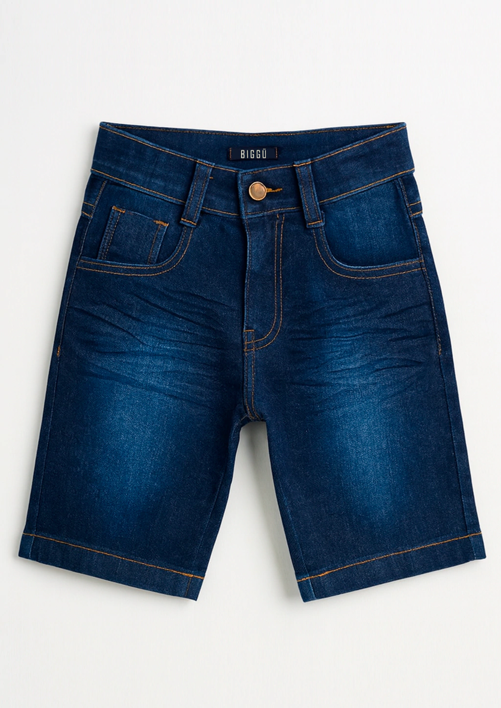 A Bermuda Jeans Infantil BIGGU é confeccionada em denim premium com elastano, garantindo conforto e liberdade de movimento. Possui lavagem média com leve efeito de used nas coxas e marcações sutis que trazem aspecto moderno e urbano.